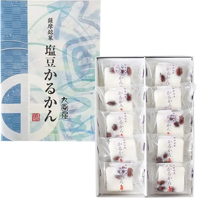 塩豆の塩気とかるかんのもちもち食感が絶妙なバランスで、甘いお菓子が苦手な方へのお土産として最適です。個包装のため配りやすく、お茶請けやお酒のおつまみとしても楽しめます。1箱600円前後で、天文館や鹿児島空港の土産店で購入できます。かるかんの新しい味わいとして注目を集めています。