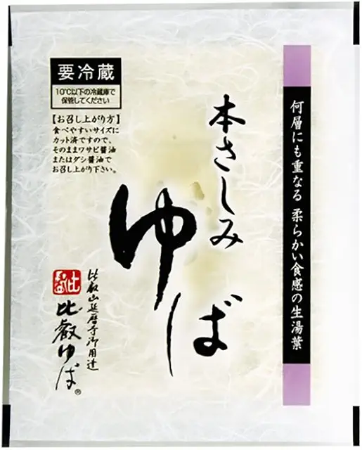 日光食品のさしみゆばは、栃木県産の大豆を100パーセント使用した日光の名産品です。とろける食感と国産大豆の濃厚な風味が特徴で、日光連山の銘水を使用し昔ながらの製法による手作りとなっています。