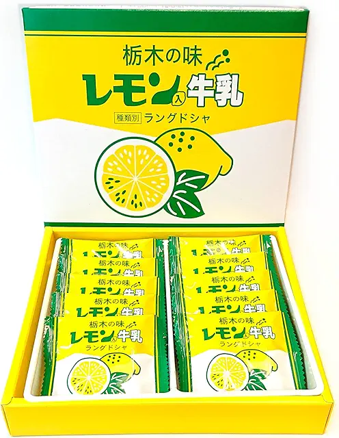 栃木県民に愛される懐かしい味わいのレモン牛乳をラングドシャにアレンジし、1袋800円前後、賞味期限は4か月と日持ちします。個包装で配りやすく、職場や友人へのばらまき用としても便利です。栃木らしいご当地感のあるお土産として人気があり、レモンの爽やかな風味が楽しめます。