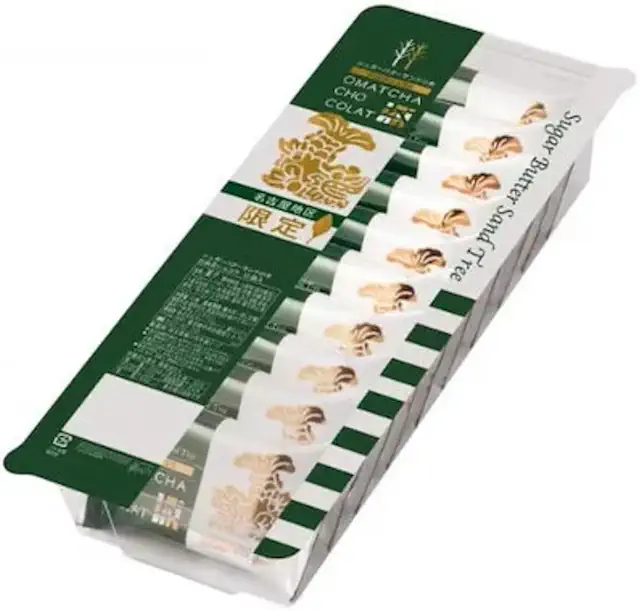 シュガーバターサンドの木は発酵バターの香るザックリ食感のシリアル生地が特徴のお菓子です。名古屋駅限定版のお抹茶ショコラは、抹茶の風味を加えたバージョンで、甘さ控えめのチョコクリームで素朴なおいしさを楽しめます。