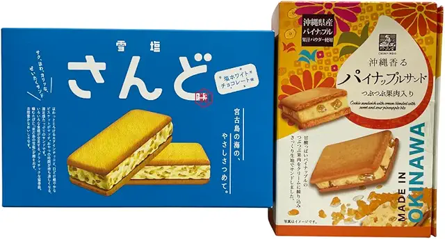 雪塩さんどは、ふわっと軽いエアインチョコと香ばしいビスケットを、特産の雪塩が上品に引き締める宮古島の大定番スイーツです。個包装で配りやすく、空港や市街地の土産店、オンラインでも購入できます。