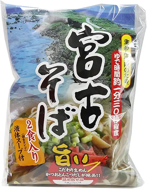 宮古そば乾麺は、宮古島のソウルフードである宮古そばを自宅で手軽に再現できる商品です。平麺が特徴で、もちもちとした食感が楽しめます。